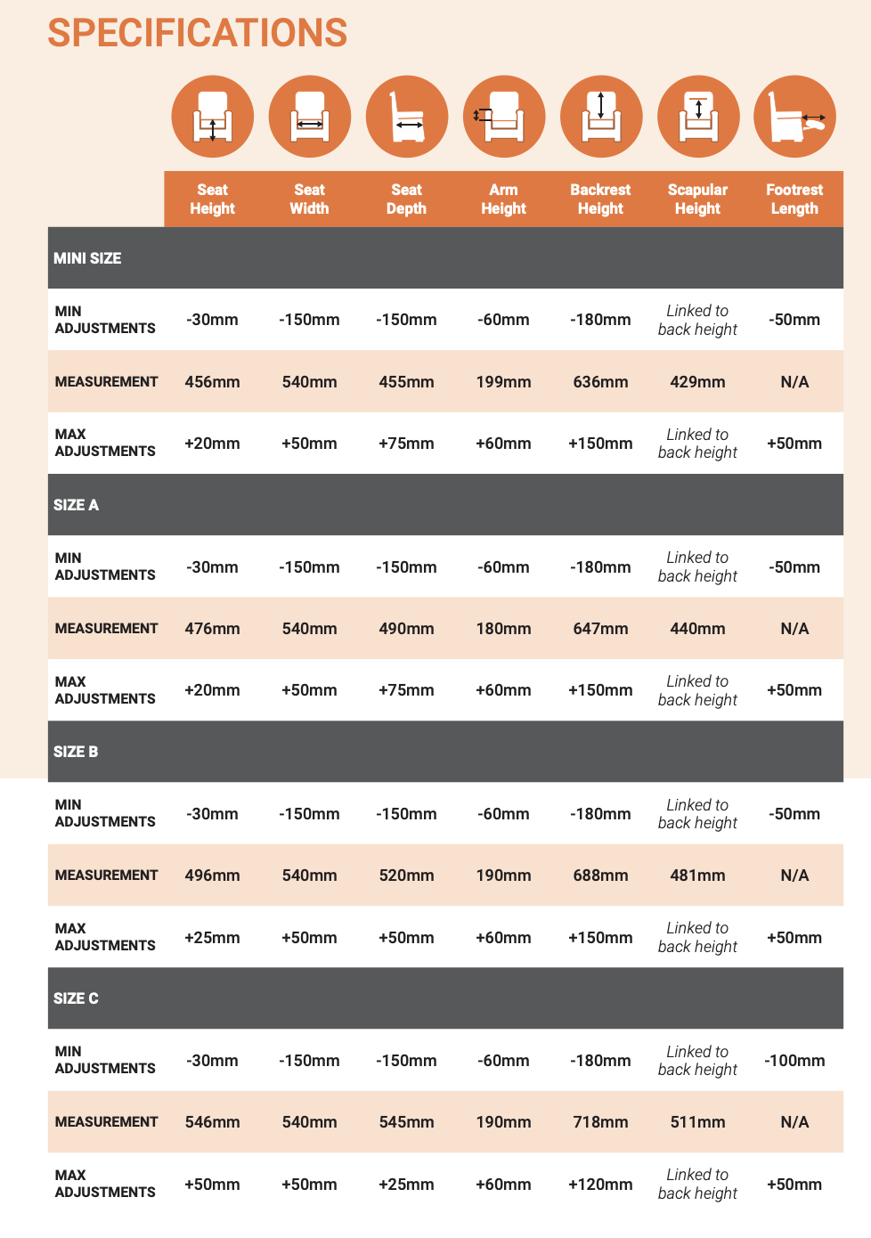 - A to suit height ranges between 157cm (5’2”) to 173cm (5’8”)